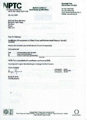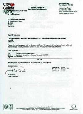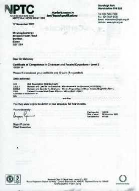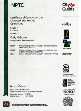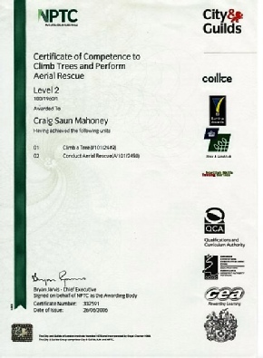 The Qualification Certificates are unique and can only be represented by the person whose name appears on them. Craig Mahoney is the only person authorised to represent Birchwood Tree Care so please be extra vigilant who you allow entry into your home.